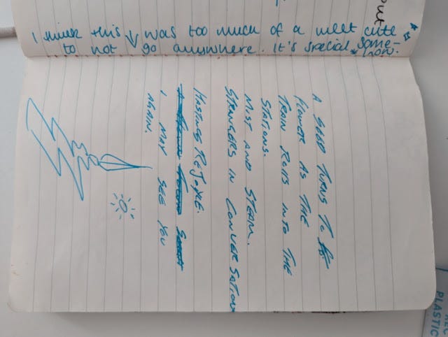 I’d mentioned somewhere along the way in the conversation that I’d studied Drama with Creative Writing — ‘right here, actually’, I’d quipped with a jerked thumb out the darkened window as we went through Winchester. Yes, hooray, we were finally on the move once again but drawing ever closer to the end — Southampton Central. He asked if, as a writer, I kept notebooks on my person, and I said yes, I love a good scribble. He said he did too. We’d already spoken about the books we liked to read, and he’d recommended me a song based on the title of the novel I had in my lap, ‘Adelaide’; he revealed that he was indeed reading poetry, that he preferred it to longer books as it meant he could dip in and out and be taken away as was convenient to him. I mentioned that I’d met a friend of mine (who I’d been on a date with the previous week, but I didn’t include that part) a couple of years ago in a pub garden and his opener was asking me if I’d write him a haiku in a notebook he produced from his coat pocket. He said he would always ask people, friends and strangers, to do this for him if they’d been talking for some time and the vibe felt right. To this day, he claims it’s the best one he’s ever received in that notebook is mine. So then we, me and this meet cute man, spent a while trying to work out the rules of the haiku, the structure of one - was it seven five seven, or five seven five? Eventually I pulled my phone out and looked it up.